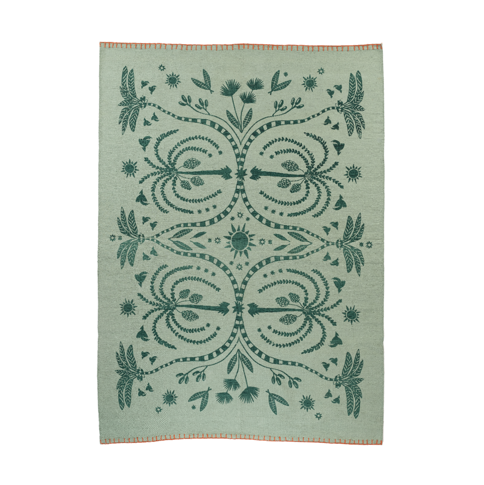 The Grove Kiliim Rug is a beautifully crafted piece that adds a touch of elegance to any space. Hand-woven on a sturdy cotton base, it features a manually silk screen-printed pattern, showcasing a blend of traditional craftsmanship and contemporary design. This rug serves as a perfect accent for living rooms, bedrooms, or any area needing a stylish enhancement.