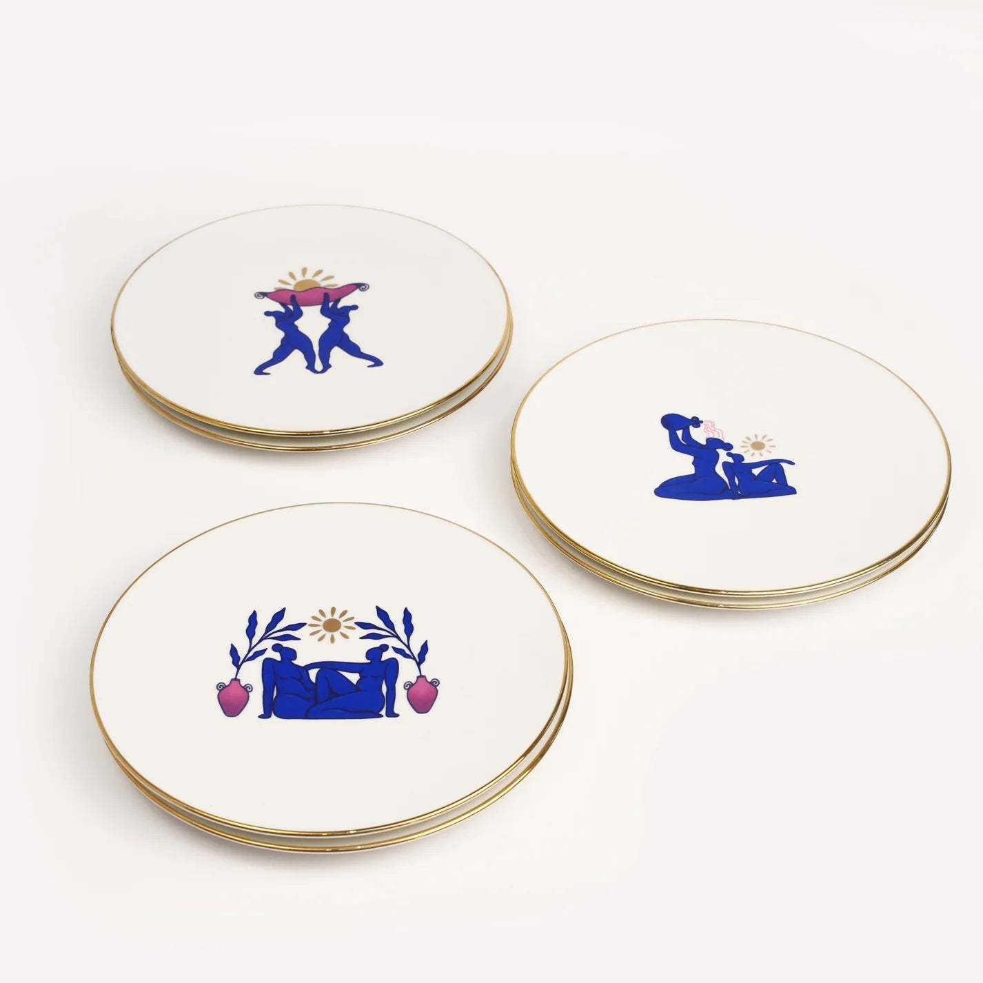 Elevate your dining experience with this Set of 6 Coup Dessert Plates, crafted from high-quality porcelain. Featuring a refined white base accented by a luxurious gold rim and artistic blue motifs, these plates bring an elegant and sophisticated touch to any table setting.