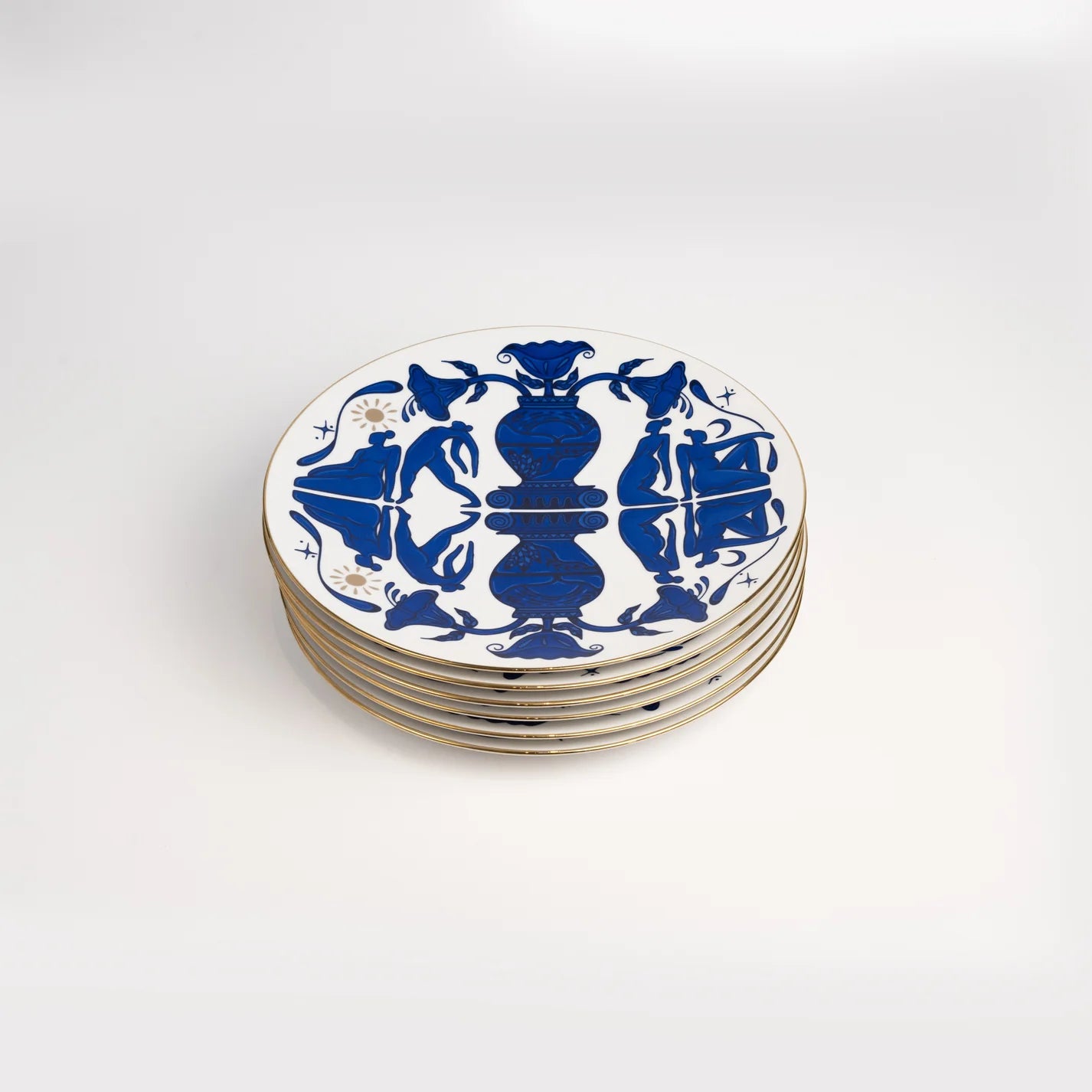 Elevate your dining experience with this Set of 6 Coup Dinner Plates, crafted from high-quality porcelain. Featuring a refined white base accented by a luxurious gold rim and intricate blue patterns, these plates bring artistic elegance to your table.