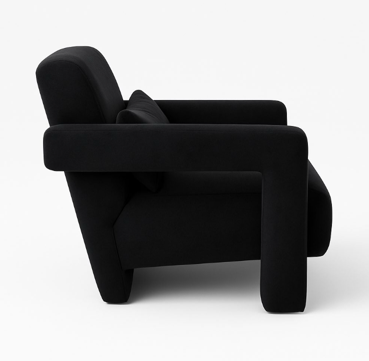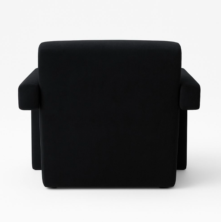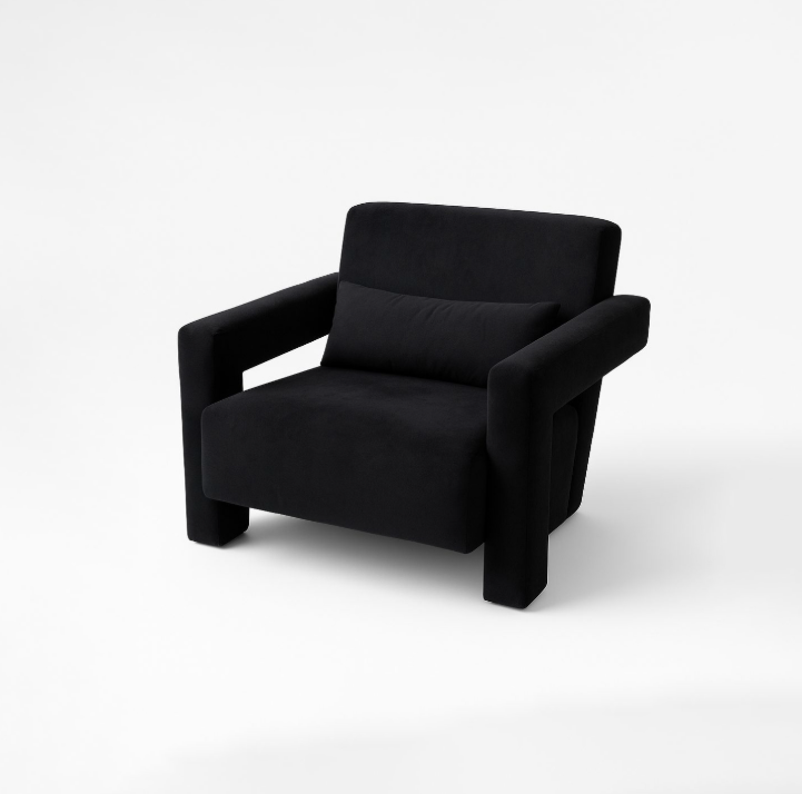 The Nova Lounge Chair is a bold statement piece that blends comfort with modern design. Upholstered in rich black velvet, it features wide, angular armrests and a generously cushioned seat with a matching lumbar pillow for added support. Its sleek geometric form and plush upholstery strike the perfect balance between contemporary elegance and cozy relaxation, making it ideal for both living spaces and reading corners.