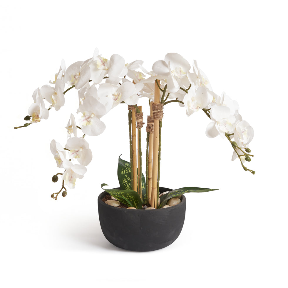 Enhance your interior with our stunning Orchids in Black Pot. These lifelike white orchids are elegantly arranged in a medium-sized grey pot, offering a perfect blend of beauty and sophistication. Ideal for any room, they bring a sense of serenity and natural grace that lasts, making them a timeless addition to your decor.