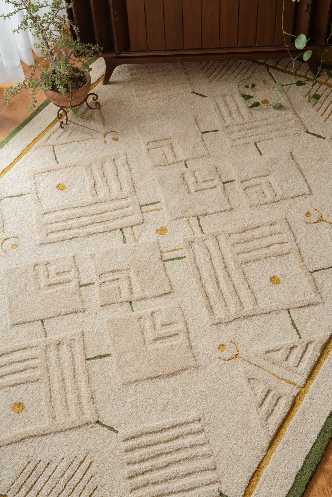The Samboksa Beige rug is a hand-tufted piece crafted from sumptuous wool, designed to enhance the comfort and aesthetic of any space. Its modern look is complemented by subtle hues and a solid color block border, making it an ideal foundation for various room styles.