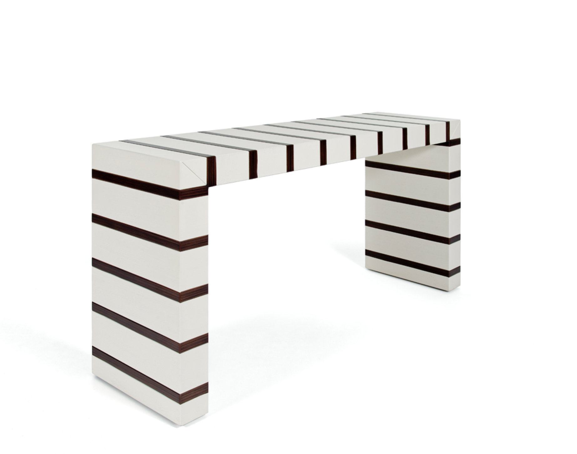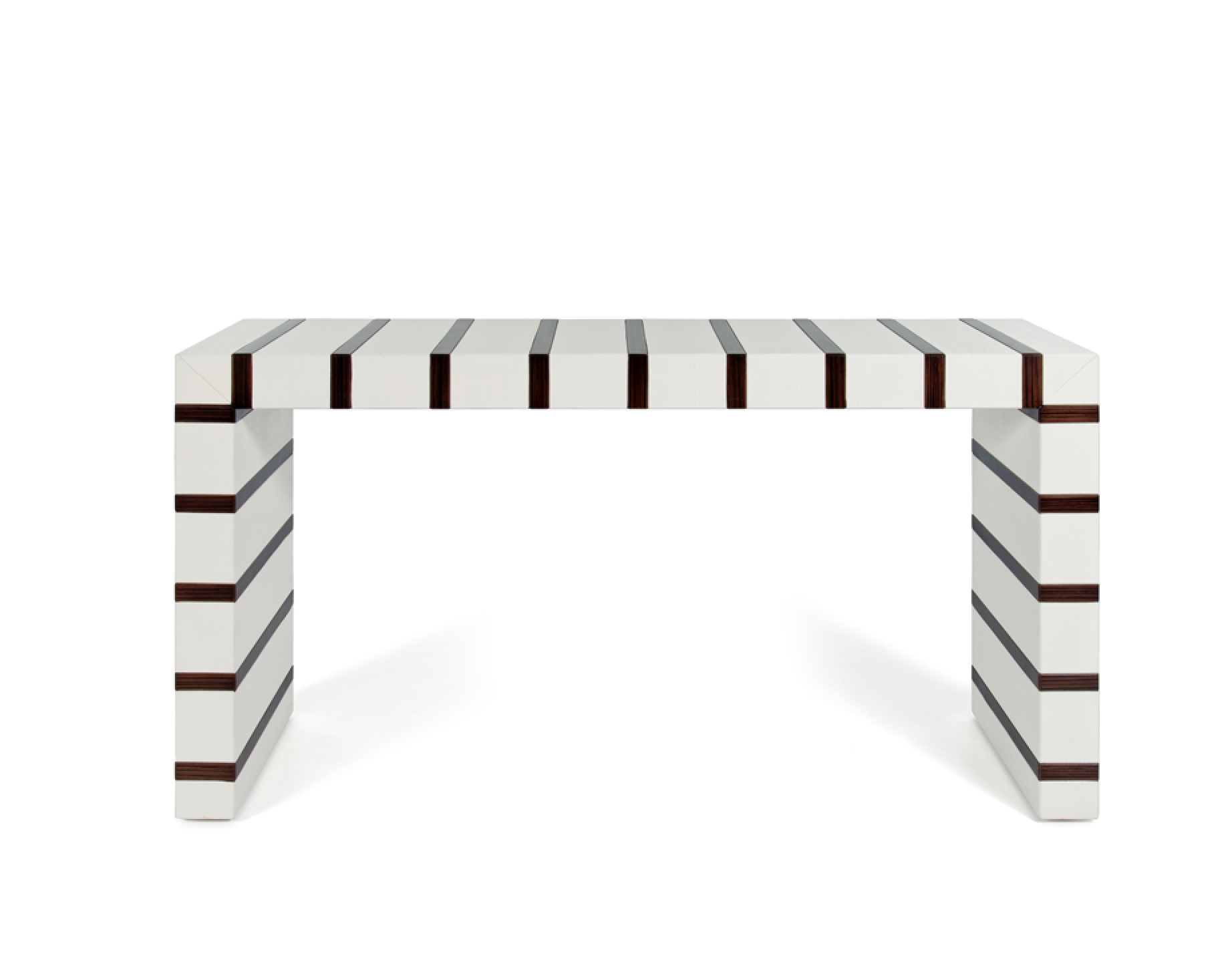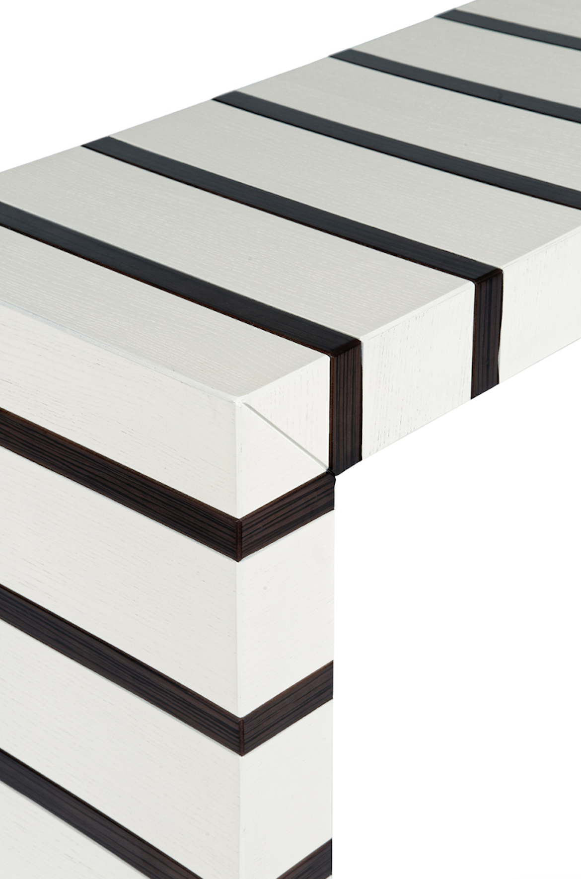An elegant console desk featuring two seamlessly integrated drawers with hidden recesses for a sleek, minimalist look. Its unique striped design combines two types of wood veneers, creating a distinctive and stylish furniture piece.