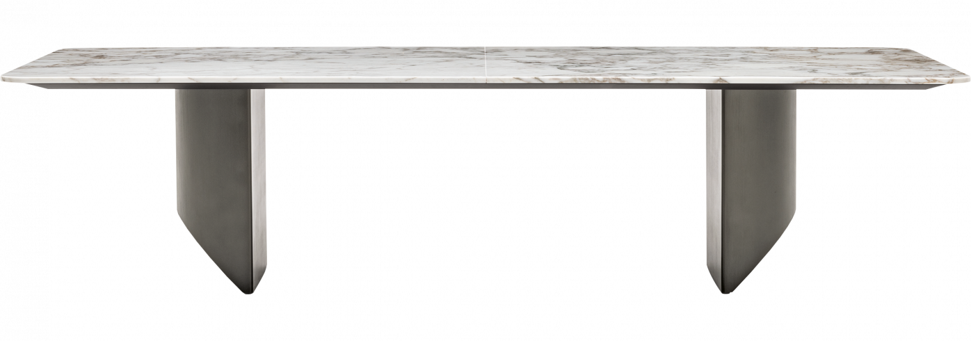 The Wedge table features solid semi-circular sculptural legs paired with lightweight feet, creating a striking contrast and modern aesthetic.